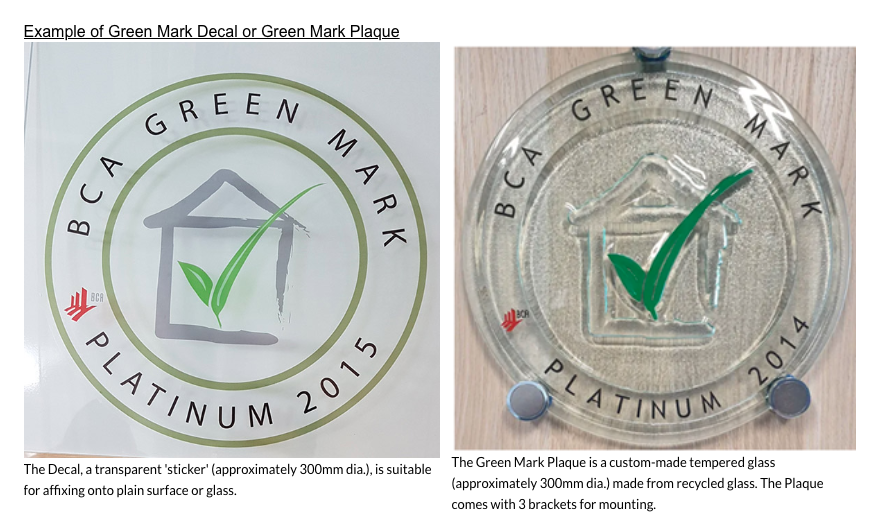 Comparison of BCA Green Mark Decal (2015) and Plaque (2014) – decal for glass, plaque in custom-made glass with mounting brackets